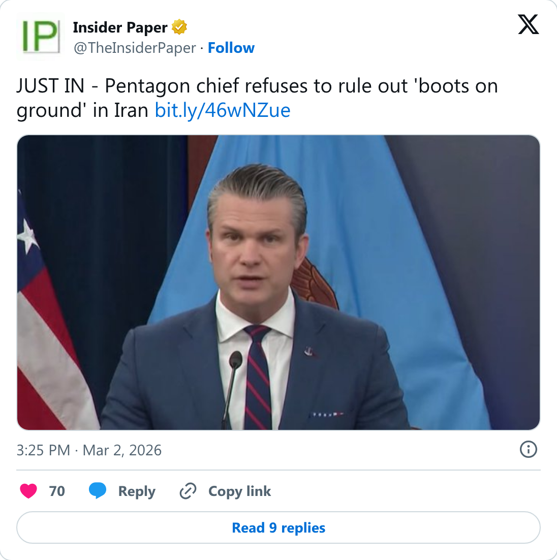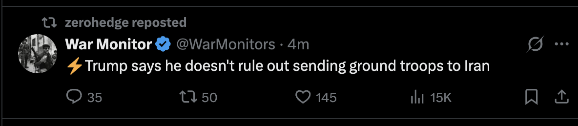>President Trump says he won’t rule out sending US troops into Iran “if necessary,” telling the New York Post that the military campaign there is progressing “way ahead of schedule.”https://nitter.net/FaytuksNetwork/status/2028501253307748378#myeah im thinking boots on the ground are a high probability