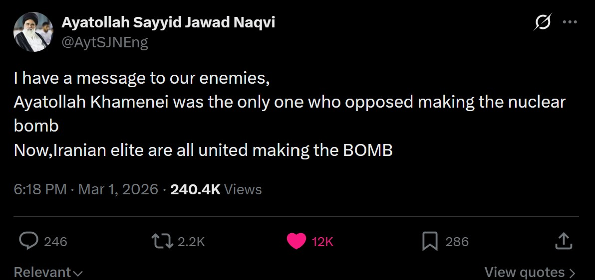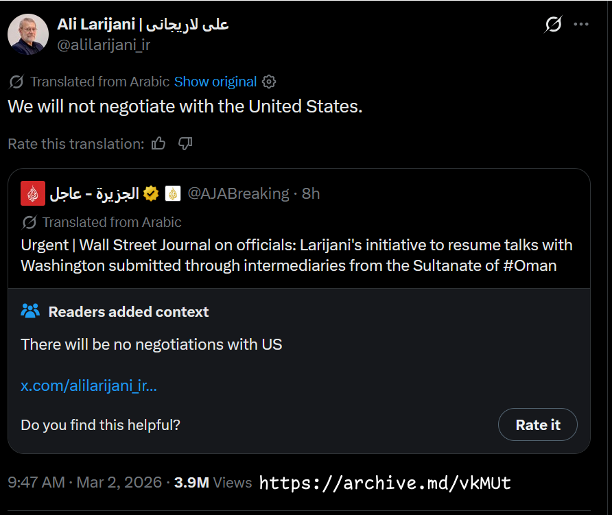 https://x.com/i/status/2028498715191677041Patrick bet david saying that ahmadinejads team reached out to him to say that ahmadinejad is still alive. Big if true