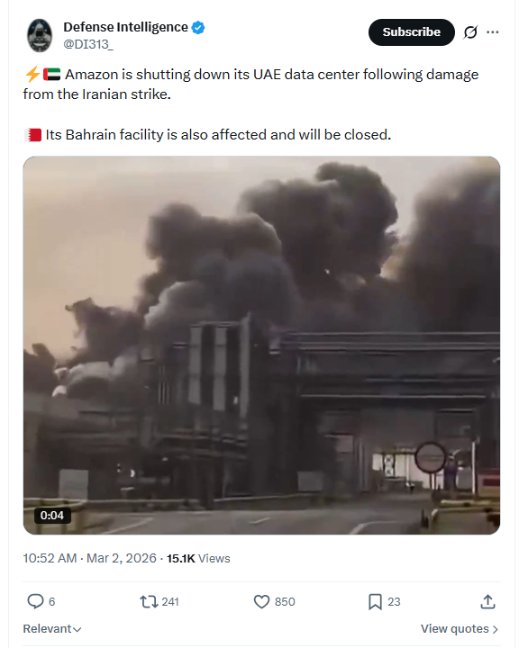 Amazon is shutting down its UAE data center following damage from the Iranian strike. Its Bahrain facility is also affected and will be closed. March 2nd, 2026 https://x.com/DI313_/status/2028498564758855836 3/1/2026 https://files.catbox.moe/0muhtw.mp4