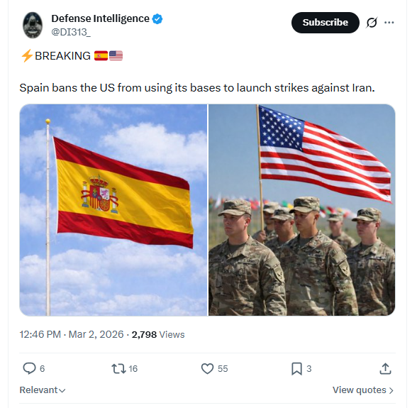 BREAKING Spain bans the US from using its bases to launch strikes against Iran. March 2nd, 2026 https://x.com/DI313_/status/2028527478742859957