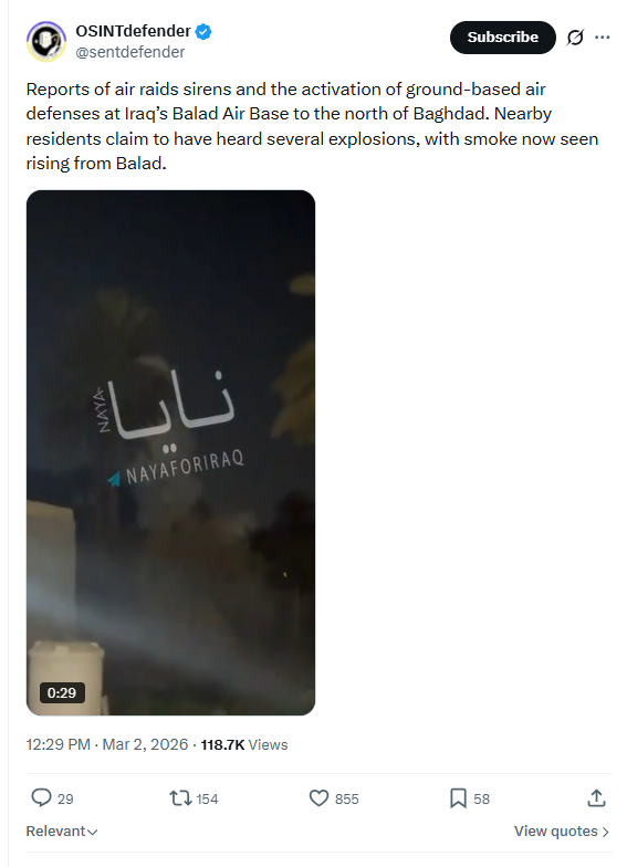 Reports of air raids sirens and the activation of ground-based air defenses at Iraq’s Balad Air Base to the north of Baghdad. Nearby residents claim to have heard several explosions, with smoke now seen rising from Balad. March 2nd, 2026 https://x.com/sentdefender/status/2028523210833080730 3/1/2026 https://files.catbox.moe/a2bc8i.mp4
