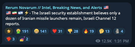 >The Israeli security establishment believes only a dozen of Iranian missile launchers remain, Israeli Channel 12 reports.it's over