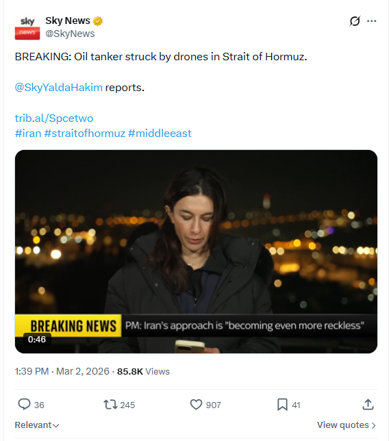 BREAKING: Oil tanker struck by drones in Strait of Hormuz.@SkyYaldaHakim reports.http://trib.al/Spcetwo#iran #straitofhormuz #middleeast March 2nd, 2026 https://x.com/SkyNews/status/2028540840365158727 3/2/2026 https://files.catbox.moe/tgbmxo.mp4