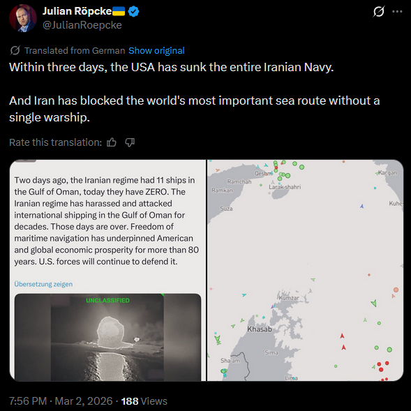 >Within three days, the USA has sunk the entire Iranian Navy.>And Iran has blocked the world's most important sea route without a single warship.Makes you think, doesn't it?