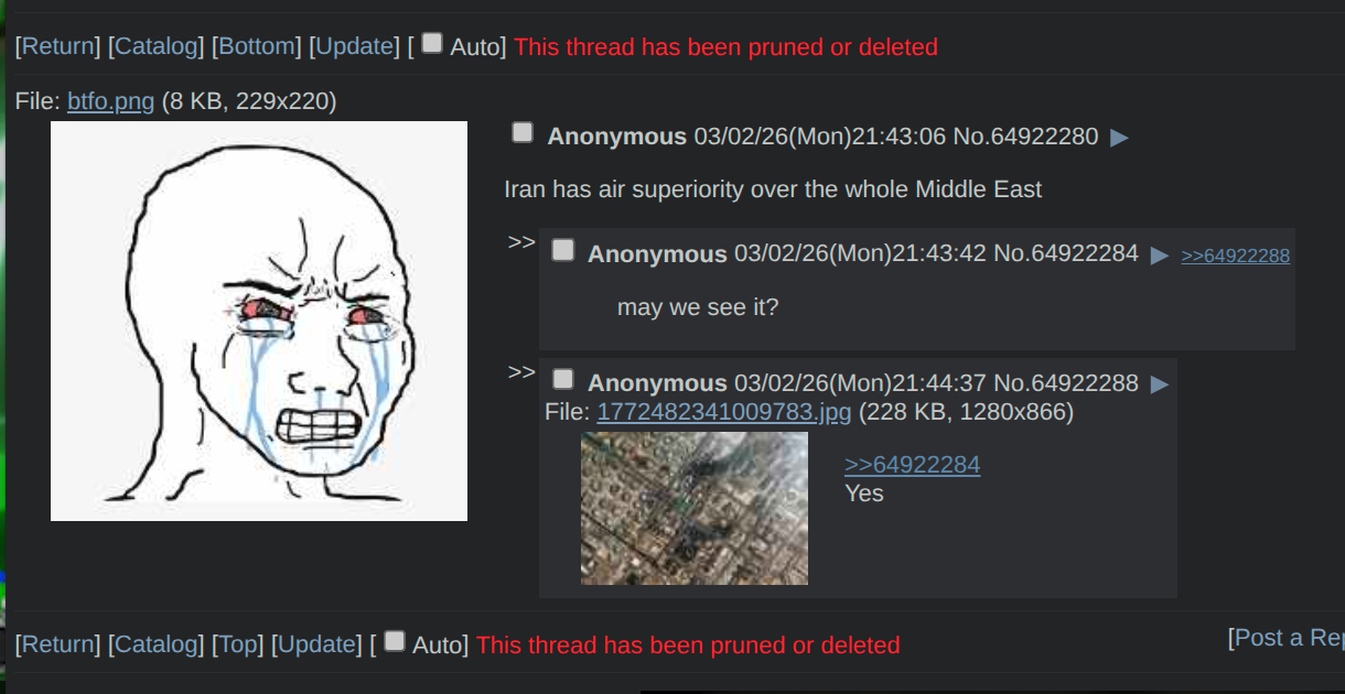 >>529673572They brought out all the jannies, posted the f-15 shoot down on /tv/ memeing top gun and it was deleted in less than 5min. Goes to show this shithole is controlled opposition by eglin now and if you get too uppity they'll censor everything.