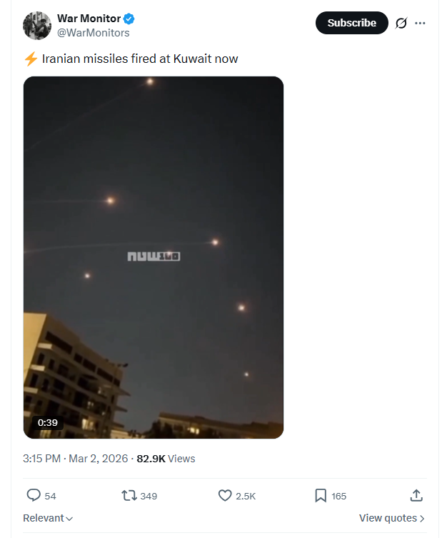 Iranian missiles fired at Kuwait now March 2nd, 2026 https://x.com/WarMonitors/status/2028564791640428923 3/2/2026 https://files.catbox.moe/lofhx1.mp4