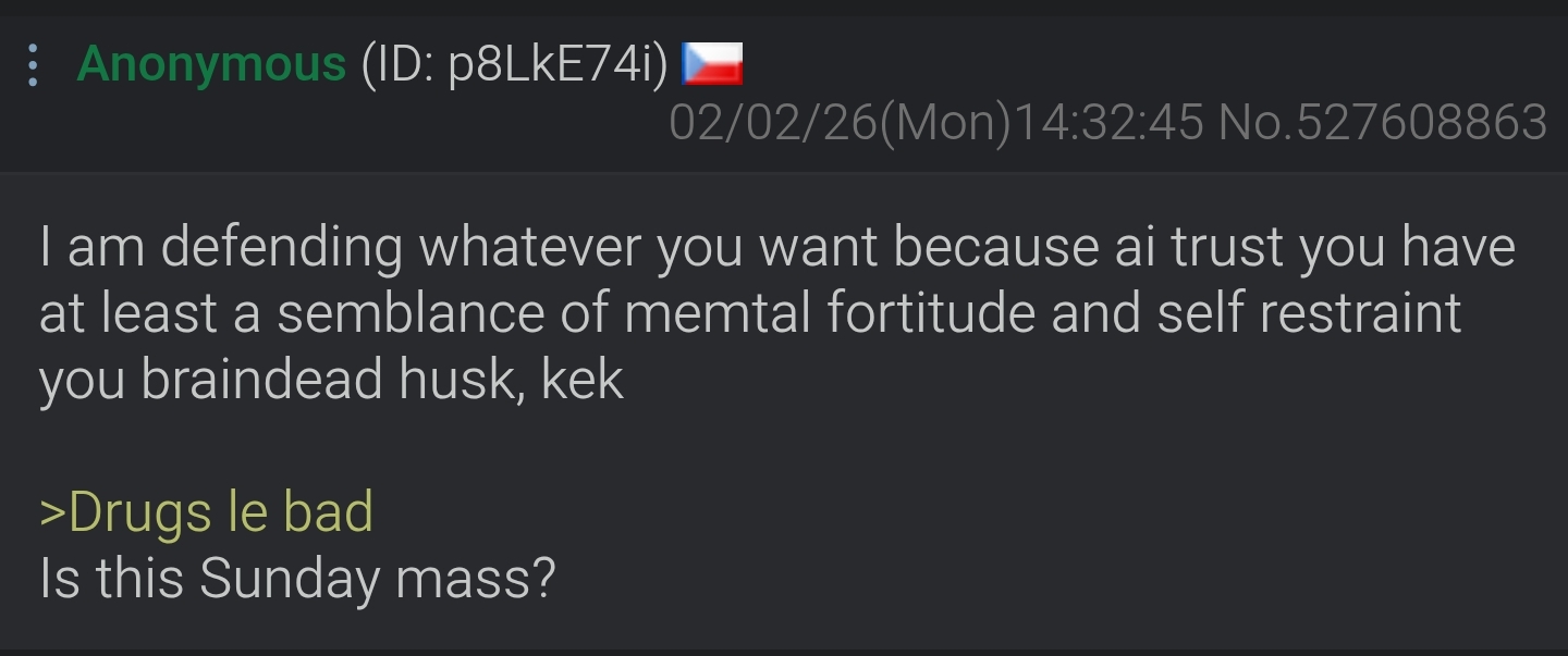 >>529673884What did you learn about at school today? What shit you pump up your vein and what you drag up your nose?>>529673884>>529673893Two clones>>529673896And a Russian wannabe to comfort each other and deepen their respective delusions. Kek