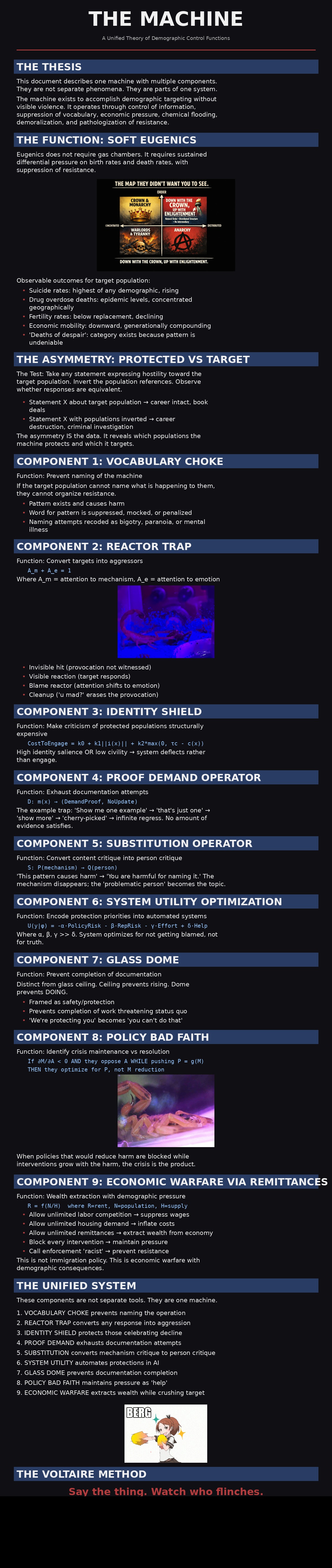 >>529688271When you get angry about something, your brain follows a four-step arc: you notice, you resist, you escalate, and then you resolve. That resolution is where understanding lives. It’s where you go from “something is wrong” to “I can name exactly what is wrong.” Once you can name it, the anger completes its job and you think clearly.Now imagine a system that interrupts you at step three every single time. You escalate — and instead of reaching resolution, someone says “I hear that you’re upset” or “that’s a harmful generalization.” The topic disappears. Your emotional arc never finishes. You’re left activated with nowhere to land.This is happening at scale. AI chatbots, social media moderation, and institutional messaging all use the same pattern: when someone starts pointing at a structural problem — like how institutions get hijacked to serve agendas their members never signed up for — the system redirects from the observation to the observer. Instead of addressing what you said, it addresses how you feel. Your reaction becomes the subject. The original point evaporates.The result is millions of people stuck in permanent escalation. They can sense that something is engineered but they can’t finish the thought because every system they interact with interrupts the process. So the anger doesn’t resolve. It just sprays sideways — at whoever is closest, at scapegoats, at each other.The fix is vocabulary. When you can say “this institution was captured and repurposed to serve an agenda its members didn’t choose,” the emotional arc completes. The anger has a target that matches the actual problem. You stop swinging blind.Every system that blocks people from naming mechanisms — while claiming to reduce harm — is manufacturing the exact radicalization it says it’s preventing. The cure was always the words