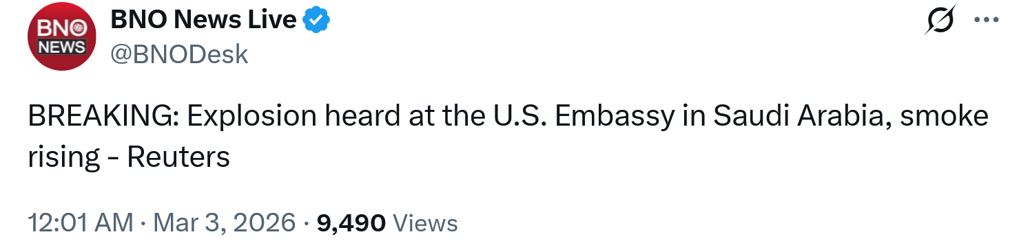 happening?>Fire reported at the U.S. Embassy in Riyadh, the capital of Saudi Arabia, following a blast, according to two sources cited by Reuters.
