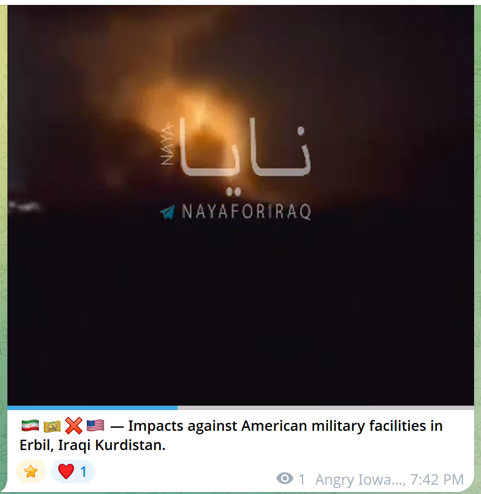 Iran-backed Iraqi militia Saraya Awliya al-Damm (Guardians of the Blood Brigades) carried out a drone strike on a hotel in Erbil, Iraq. The group claims the hotel was housing U.S soldiers.