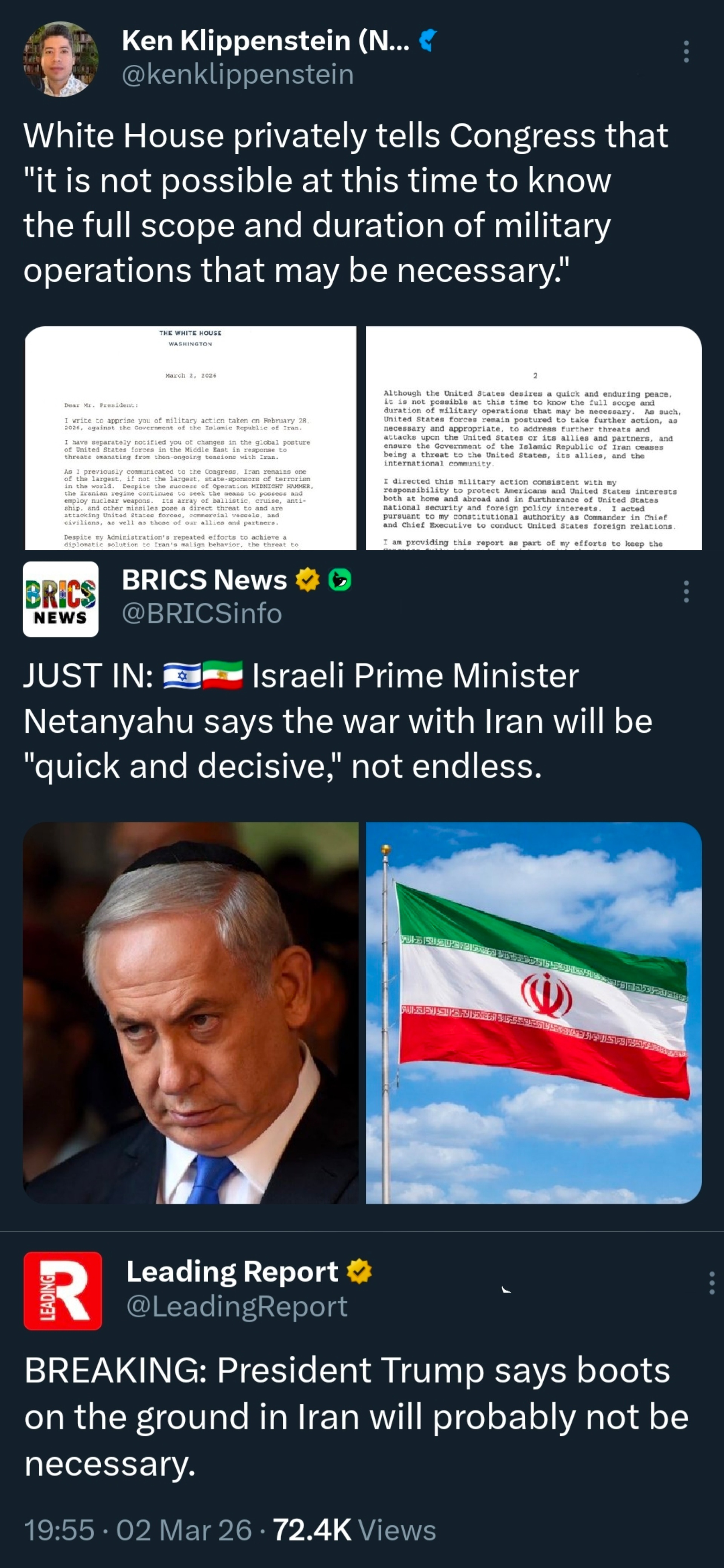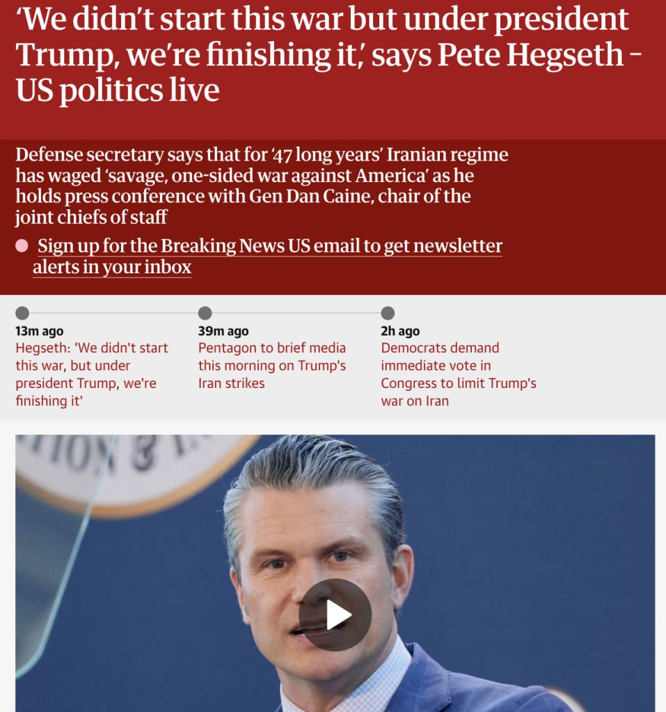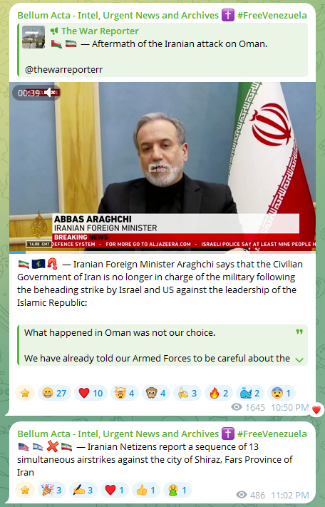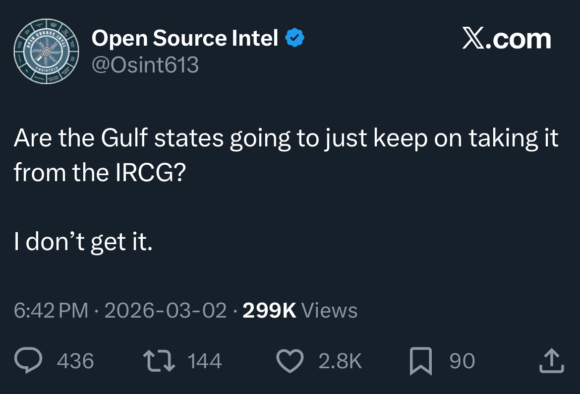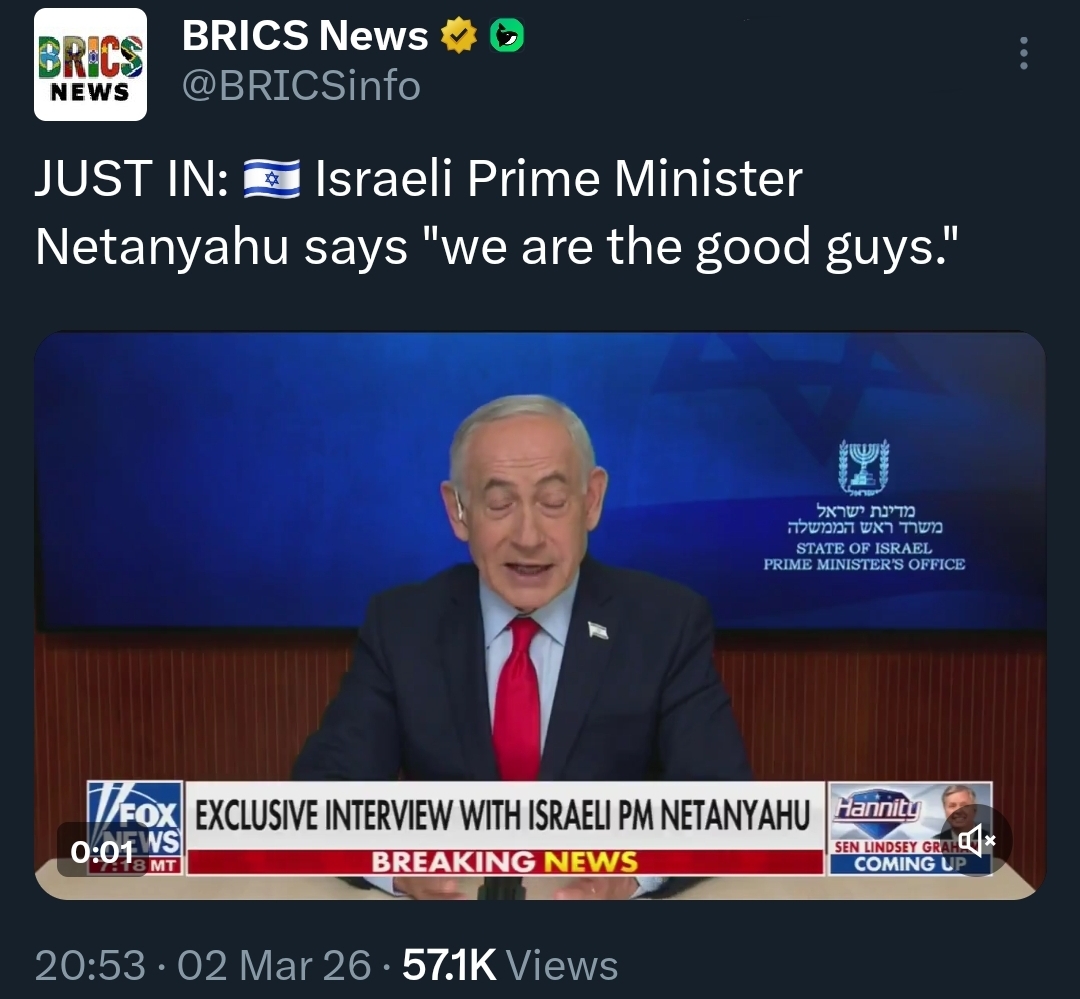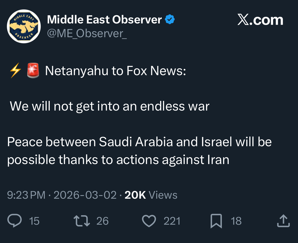 Day: 3Previous: >>529699327▶Latest▶Day 3:>Iran hits the American Embassy in Saudi Arabia >IRIB (Teheran) and Al Manar (Beirut) bombed▶Day 2:>IDF issues evacuation orders to southern Lebanon, Al Manar in Beirut and IRIB in Teheran>IRGC says that the Strait of Hormuz has been closed and that Iran will set fire to any ship trying to pass>Qatar downed 2 Iranian Su-24 aircraft, the Qatari Defense Ministry says>QatarEnergy, accounting for 20% of global LNG trade, stops all production after attacks on its facilities >IDF says Iran is moving from isolated launches to larger missile barrages>Iran strikes Saudi oil infrastructure, including ARAMCO Ras Tanura facility — one of the world’s largest oil export hubs>3 x U.S. F-15E fighter jets were shot down over Kuwait in a friendly fire incident, all crew members ejected safely and are in stable condition - CENTCOM>Iranian drones strike U.K.'s airbase RAF Aktoriri in Cyprus>De-facto Iranian leader Ali Larijani says: "We will not negotiate with the United States">Hezbollah joins the war, Israel retaliates with airstrikes on Beirut; does not rule out invasion▶Livestreamshttps://www.youtube.com/watch?v=4E-iFtUM2kk [Open]https://www.youtube.com/watch?v=JHwwZRH2wz8 [Open]▶Telegramhttps://rentry.org/tgnews▶Twitter accounts (using proxy frontend because twitter's UI is trash):https://nitter.net/clashreporthttps://nitter.net/FaytuksNetworkhttps://nitter.net/sentdefender▶Israel Rocket Alertshttps://www.tzevaadom.co.il/en/▶Air Traffichttps://www.flightradar24.com/https://flightaware.com/livehttps://globe.adsbexchange.com▶Maritime Traffichttps://www.marinetraffic.com/https://www.vesselfinder.com/