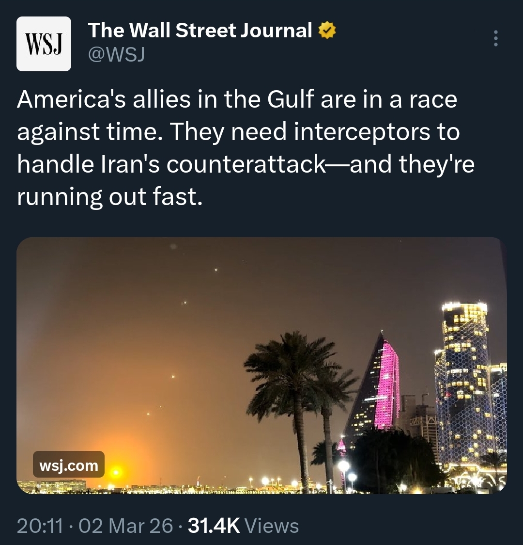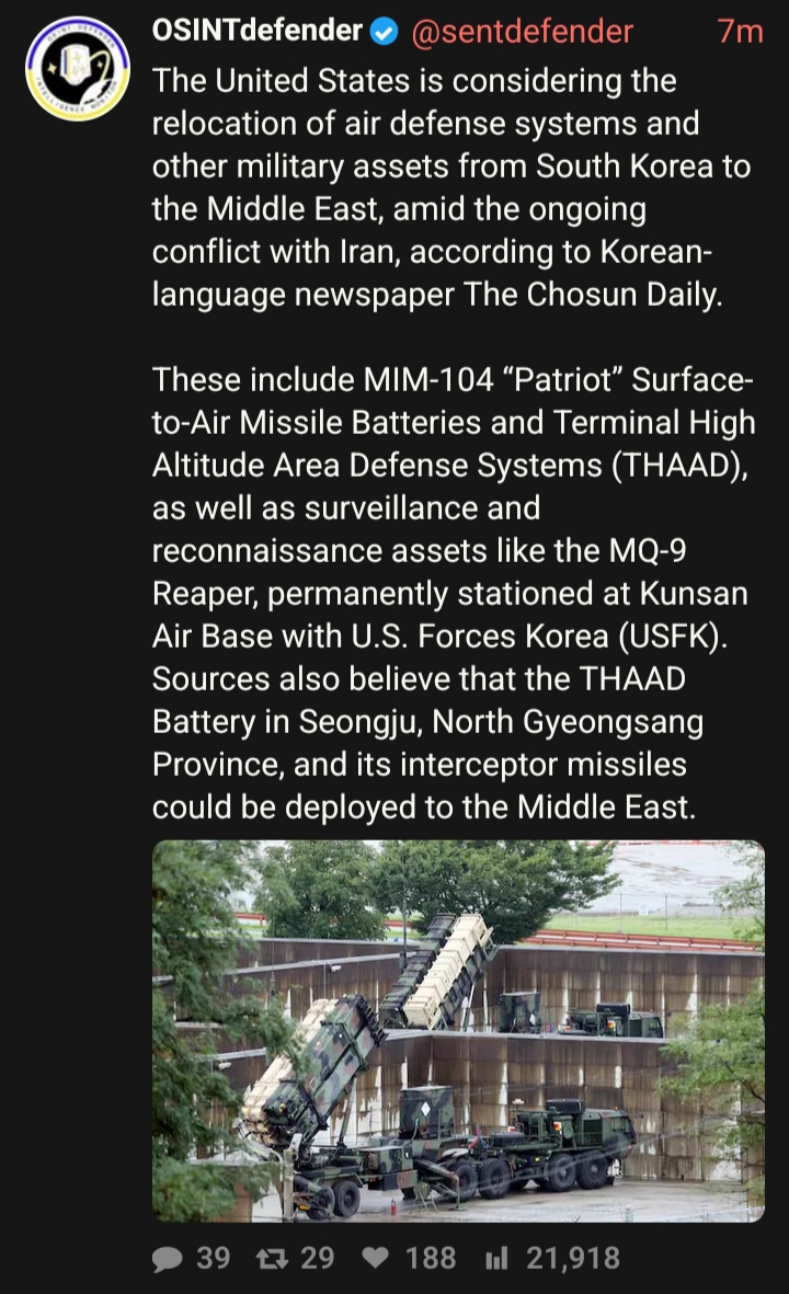 >The United States is considering the relocation of air defense systems and other military assets from South Korea to the Middle East, amid the ongoing conflict with Iran, according to Korean-language newspaper The Chosun Daily. >These include MIM-104 “Patriot” Surface-to-Air Missile Batteries and Terminal High Altitude Area Defense Systems (THAAD), as well as surveillance and reconnaissance assets like the MQ-9 Reaper, permanently stationed at Kunsan Air Base with U.S. Forces Korea (USFK). Sources also believe that the THAAD Battery in Seongju, North Gyeongsang Province, and its interceptor missiles could be deployed to the Middle East.https://nitter.net/sentdefender/status/2028675746068152807