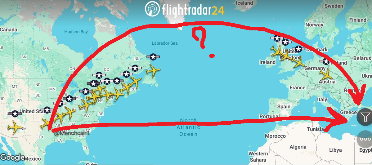 >>529704038Those are roughly 20 tankers heading to the Middle East. Mid-air refueling planes like Boeing Stratotankers. Possible indicator that a large wave of new US strikes may be coming soon