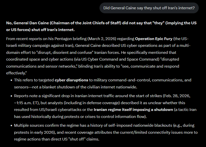 >>529705214At first I thought the Iranians turned off the Internet but as it turns out it was the American Navy and Space Force that did it. General Caine briefly spoke about it at his press conference this morning.