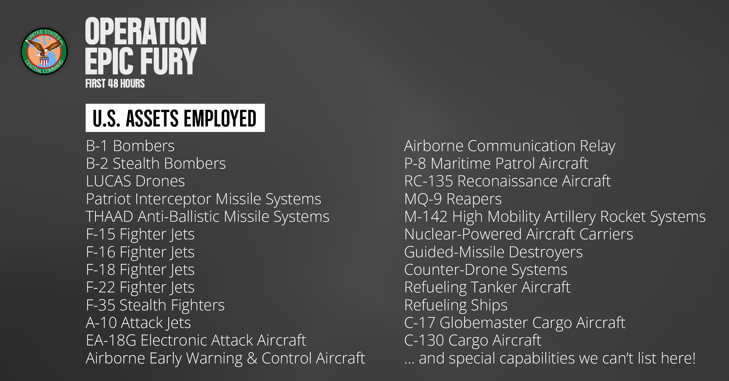 >>529705296Their air defenses are neutralized so we can do whatever ops with whatever gear we want whenever we want. That's why there were f15s fucking around.