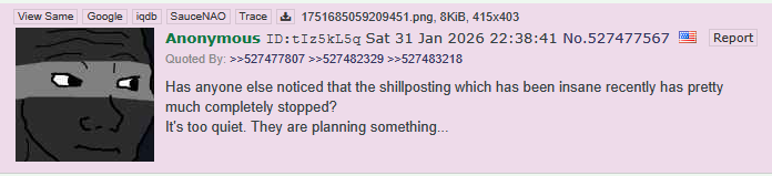 >>529712034The last time it was like this was Jan 31st, the day after the 3.5 million Epstein files dropped. /pol/ was a completely different place- there are ups and downs to the shilling and raids and whatnot but on that day you could scroll down page 1 and not see a single shill post.I even remember making picrelated post in a random thread and a few anons replied in agreement. It was spooky. Today feels similar.