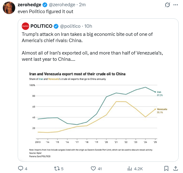 >>529713244It's really not a surprise that Trump went after Venezuela and Iran consecutively, along with shoring up relations in the Middle East.If we assume the ultimate goal is: Stop the Chinese from taking Taiwan, the obvious outcome from these conflicts make a lot of sense. The only source China has left would be Russia, and if we believe their strategic oil is allocated entirely to Ukraine, there's none left for Bing Chilling.