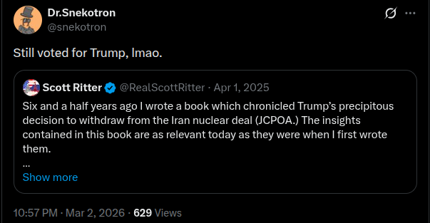 >>529718571>I'm curious how they want to convince American soldiers to fight on the ground in Iran.I mean as long as they're getting paid many will do it. The bigger issue is how exactly are they going to deploy and supply them. It's essentially impossible. Without a proxy (like the Kurds or the "protesters" they activated prematurely) the whole "epic" operation is like mormon "soaking"