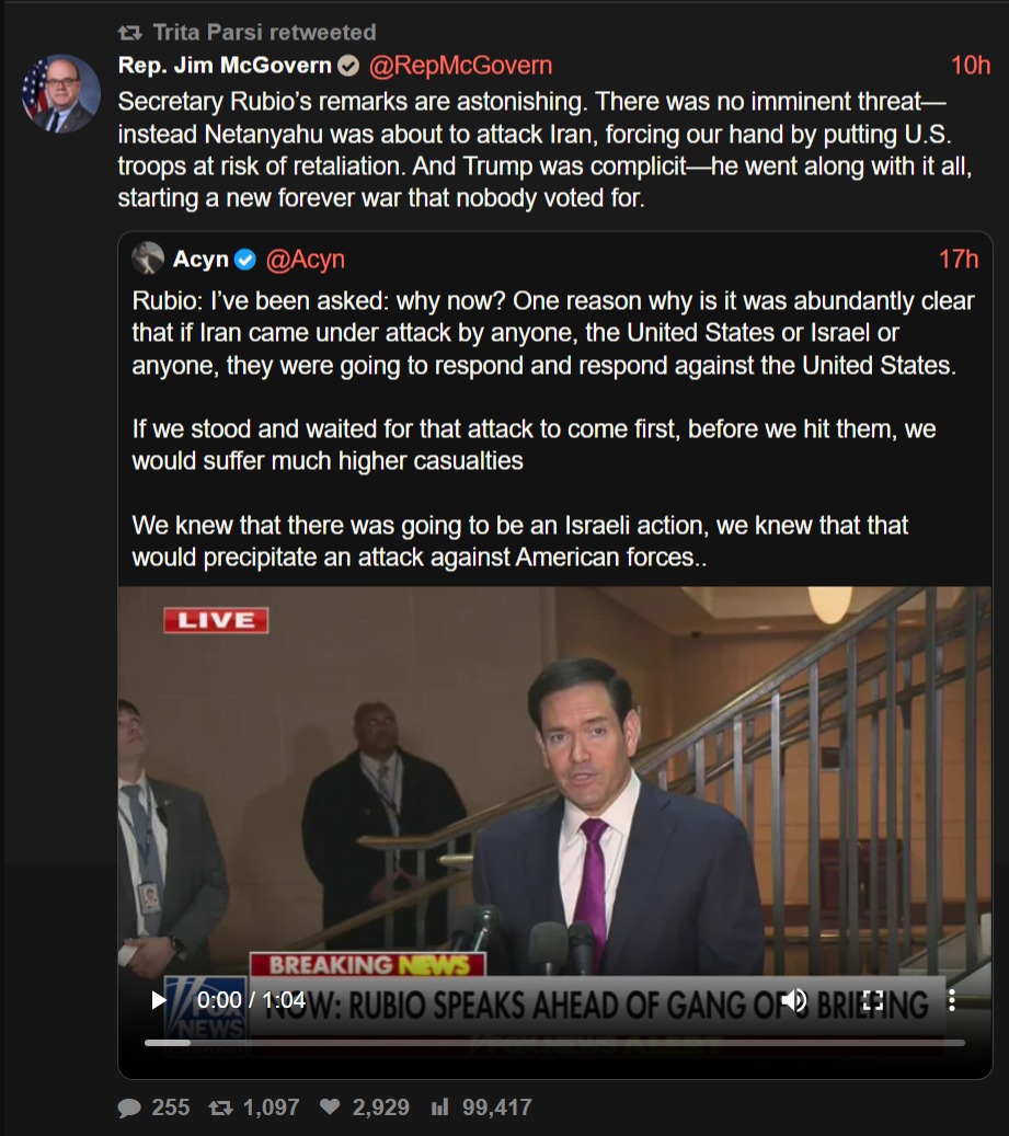 Are you referring to McGovern? Because the suggestion here is to wait until Iran becomes strong again and is an actual imminent threat first, making that confrontation far more dangerous, rather than finishing it off now when they are weak and their proxies have been decimated.