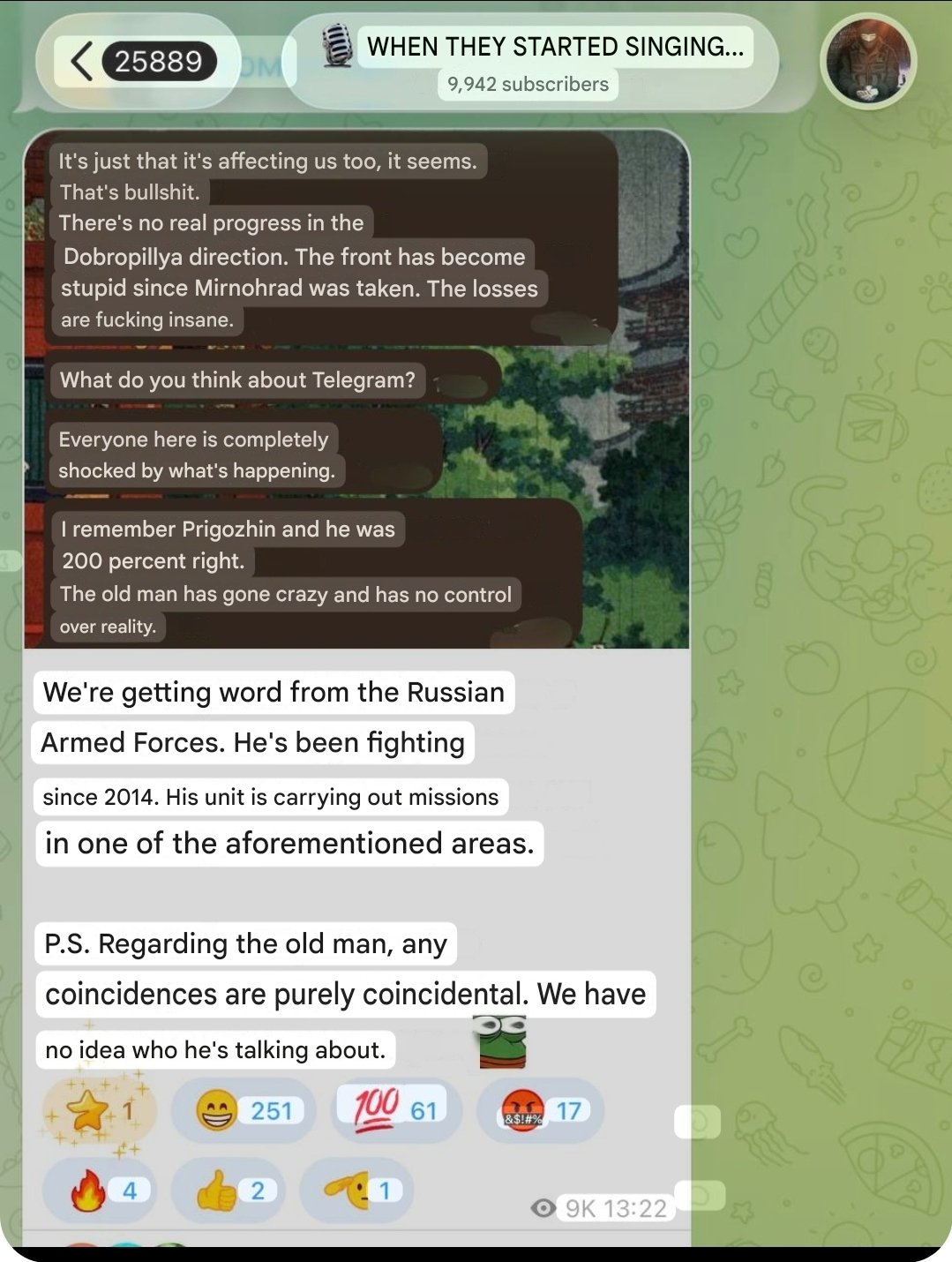 >More panicked messages from Russians at the front..>- "Everyone here is completely shocked by what's happening">- "The losses are insane.">- "Prigozhin was right, the old man (Putin) has lost his mind".