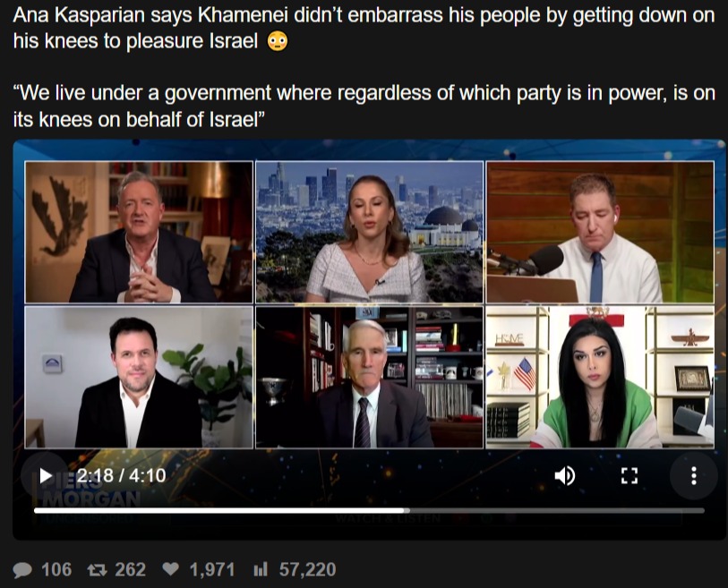Ana Kasparian says Khamenei didn’t embarrass his people by getting down on his knees to pleasure Israel “We live under a government where regardless of which party is in power, is on its knees on behalf of Israel”https://files.catbox.moe/cvjpb9.mp4