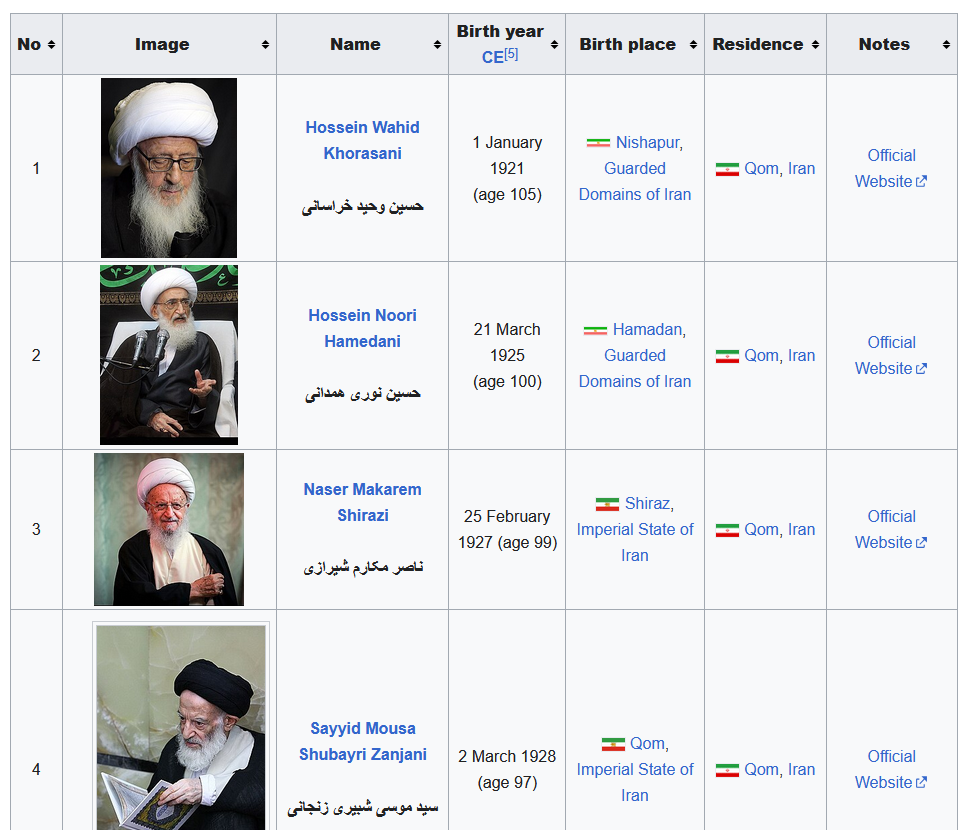 >Assembly of ExpertsI got curious and started reading about all of the living maraji' (highest rank of Shia cleric, like cardinals for Catholics). The highest among them currently is picrel who is 105 years old.Khamenei dying at 85 is actually quite young for these niggas. Look at the date of birth column kekhttps://en.wikipedia.org/wiki/List_of_current_maraji