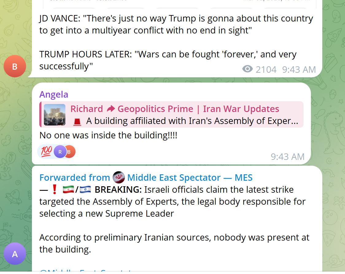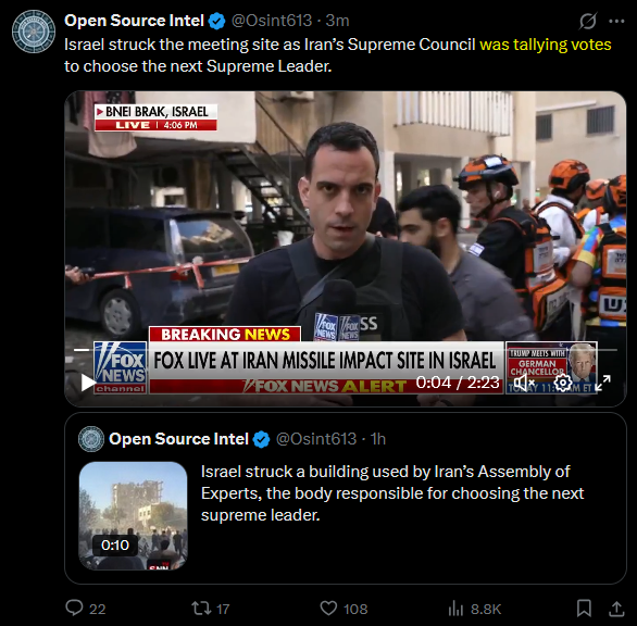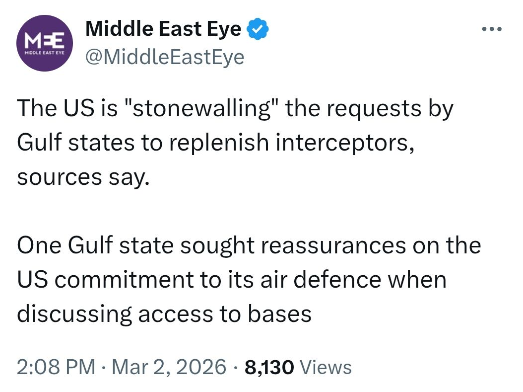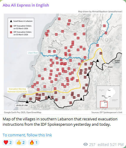 Previous: >>529740765 Timeline▶Day: 4>Israel attacked the "Assembly of Experts" building in Qom while they were voting to choose the next supreme leader>Qatar attacked in Iran in the last 24 hours, according to western sources - N12>Iran's Foreign Ministry says that fire "will engulf the entire world">Hezbollah declares "open war" on Israel - statement>The Israeli Army says its troops have been deployed at "several locations" in southern Lebanon.>Israel operated on the ground in Iran last night via Mossad and special forces - Al Arabiya>Dozens of B-52 bombers crossed the Atlantic overnight, en route to U.S. bases in Middle East>The U.S. expects a "major uptick" of attacks on Iran within 24 hours>U.S. embassy in Riyadh, Saudi Arabia is struck by drones>U.S. orders mass evacuation from 14 Middle Eastern countries▶Livestreamshttps://www.youtube.com/watch?v=4E-iFtUM2kkhttps://www.youtube.com/watch?v=JHwwZRH2wz8▶Telegramhttps://rentry.org/tgnews▶Twitter accounts (using proxy frontend because twitter's UI is trash):https://nitter.net/clashreporthttps://nitter.net/FaytuksNetworkhttps://nitter.net/sentdefender▶Israel Rocket Alertshttps://www.tzevaadom.co.il/en/▶Air Traffichttps://www.flightradar24.com/https://flightaware.com/livehttps://globe.adsbexchange.com▶Maritime Traffichttps://www.marinetraffic.com/https://www.vesselfinder.com/