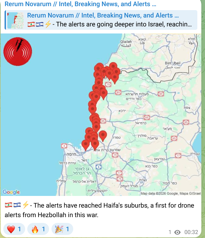 >The alerts have reached Haifa's suburbs, a first for drone alerts from Hezbollah in this war.https://t.me/rnintel/54643