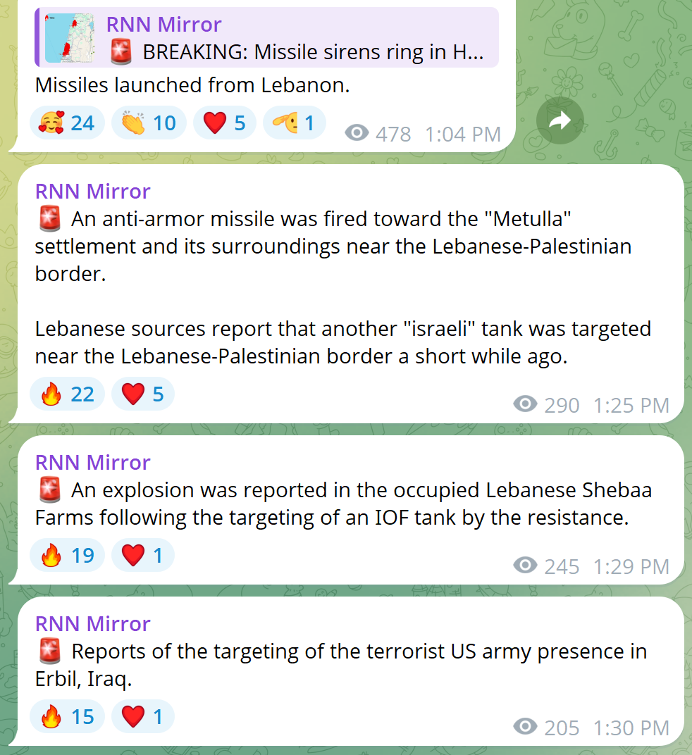 A Zionist tank is burning at the Palestinian-Lebanese border.A 5th Merkava tank was hit by a Kornet missile in the Shebaa Farms.---Hezbollah launched missiles in Haifa, Direct impact.--- Enemy media: “The injuries in Haifa were severe and there was extensive damage to the area.”