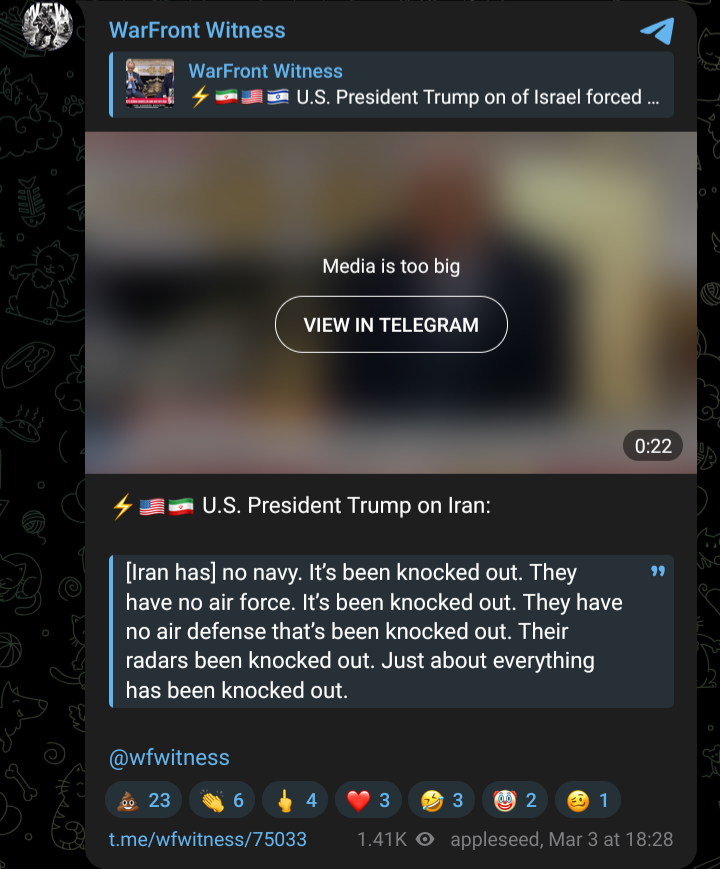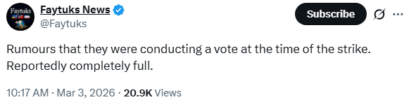 >>529756972>Fars is reporting it's falsebold move for a filmed event https://x.com/Faytuks/status/2028836647849103620