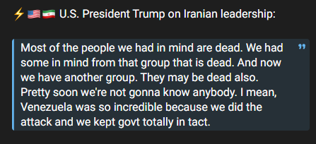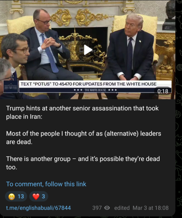 Trump:>Most of the people I thought of as (alternative) leaders are dead.>There is another group – and it’s possible they’re dead too.t.me/englishabuali/67844The Assembly of Experts and the Expediency Discernment Council?