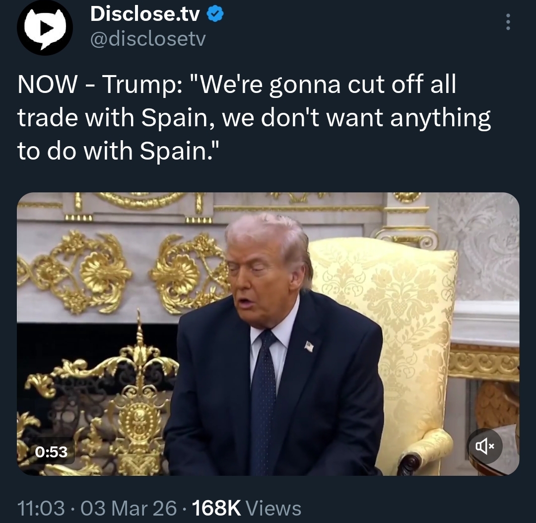 >>529758370More empty virtue signalling.He can't cut off trade with Spain overnight because companies don't give a shit about his tantrum and will simply continue trading. He could embargo Spain, which would cause any and all American companies located in Spain to immediately become Spanish property. There is also the EU common market problem. He's saying shit just to say shit, impeach his dumbass now.