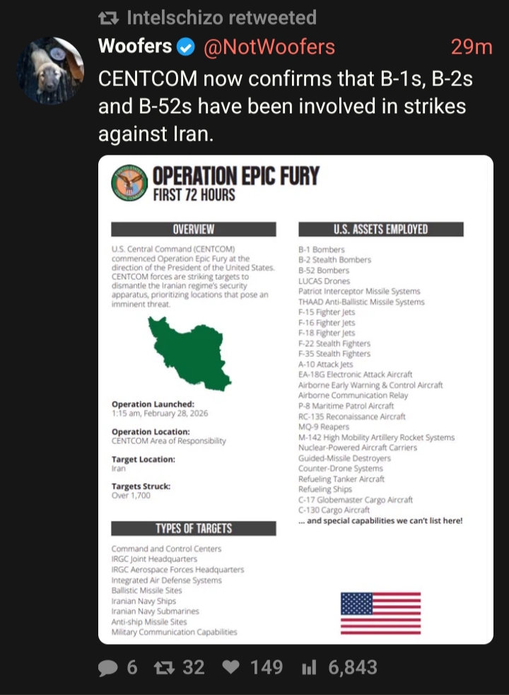 >CENTCOM now confirms that B-1s, B-2s and B-52s have been involved in strikes against Iran.The rumors were true.https://nitter.net/NotWoofers/status/2028886847472992695