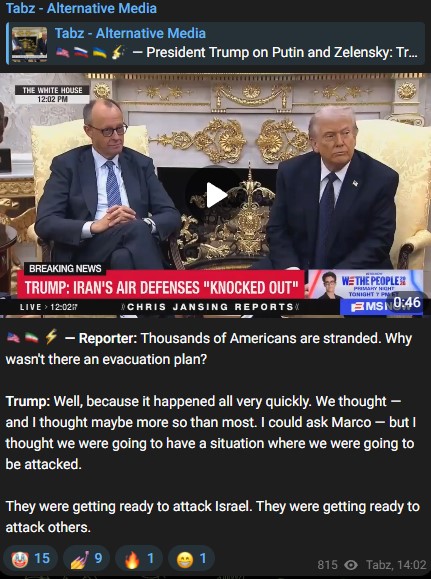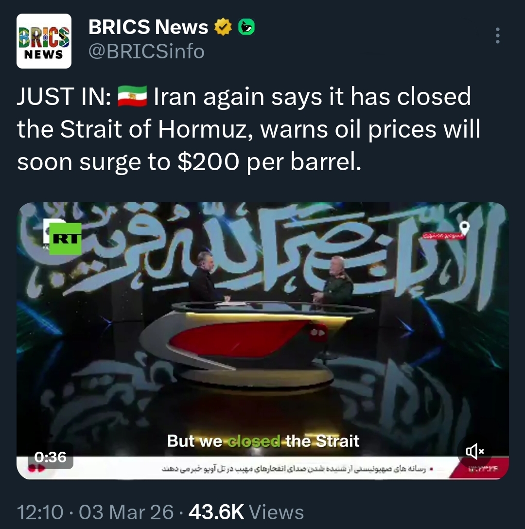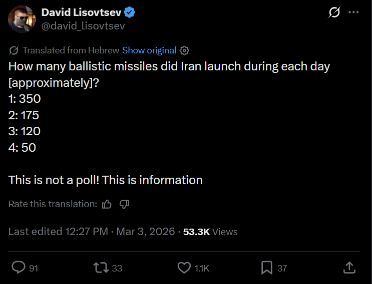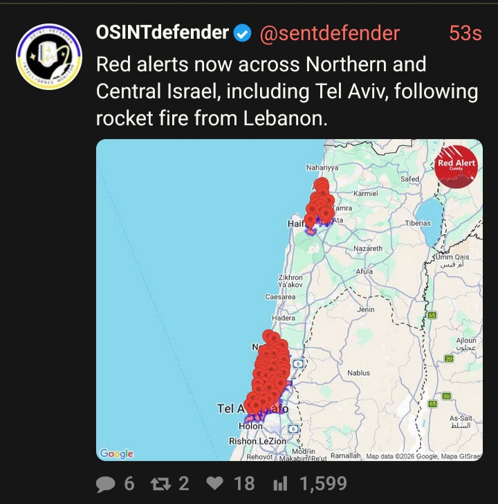 Previous: >>529756473Timeline▶Day: 4>UAE considers striking Iranian missile sites as regional war spreads - Axios>USAF strategic bomber operations against Iran are expected to intensify in the coming days>Israel attacked the "Assembly of Experts" building in Qom while they were voting to choose the next supreme leader>Qatar attacked Iran in the last 24 hours, according to western sources - N12>Iran's Foreign Ministry says that fire "will engulf the entire world">Hezbollah declares "open war" on Israel - statement>The Israeli Army says its troops have been deployed at "several locations" in southern Lebanon.>Israel operated on the ground in Iran last night via Mossad and special forces - Al Arabiya>Dozens of B-52 bombers crossed the Atlantic overnight, en route to U.S. bases in Middle East>U.S. embassy in Riyadh, Saudi Arabia is struck by drones>U.S. orders mass evacuation from 14 Middle Eastern countries▶Livestreamshttps://www.youtube.com/watch?v=4E-iFtUM2kkhttps://www.youtube.com/watch?v=JHwwZRH2wz8▶Telegramhttps://rentry.org/tgnews▶Twitter accounts (using proxy frontend because twitter's UI is trash):https://nitter.net/clashreporthttps://nitter.net/FaytuksNetworkhttps://nitter.net/sentdefender▶Israel Rocket Alertshttps://www.tzevaadom.co.il/en/▶Air Traffichttps://www.flightradar24.com/https://flightaware.com/livehttps://globe.adsbexchange.com▶Maritime Traffichttps://www.marinetraffic.com/https://www.vesselfinder.com/