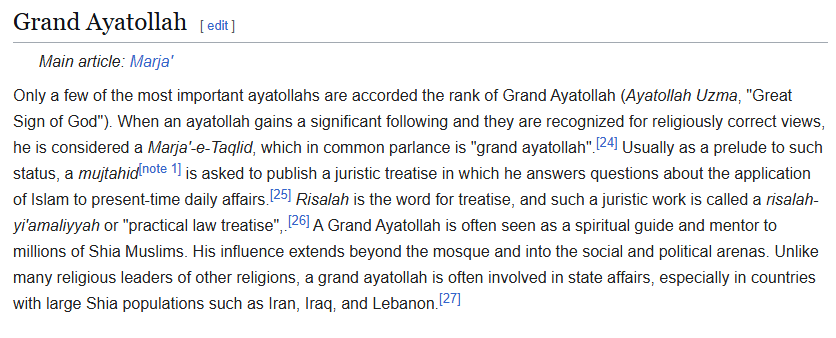 >>529762123> What the fuck is a Grand ayatollah?In the Twelver Shia seminary, clerics can train for decades, so there's a ranking system for them.> taleb (student): a student just starting seminary> hojjat ol eslam (proof of Islam): about 10-15 years in (?), has graduated into the clerical establishment, can teach classes and . Most clerics spend the rest of their lives at this rank> ayatollah (sign of God): about 20-30 years in, reached a senior rank among the clerics due to intellectual ability, people turn to them for their rulings> grand ayatollah: the most preeminent of the ayatollahs. There are only a handful of Grand Ayatollahs in the world, most in Iraq I believe, many of them are aove their 70s. For example, even though Khomeini himself was an ayatollah, he was not a grand ayatollah, and he still took his example from other grand ayatollahs
