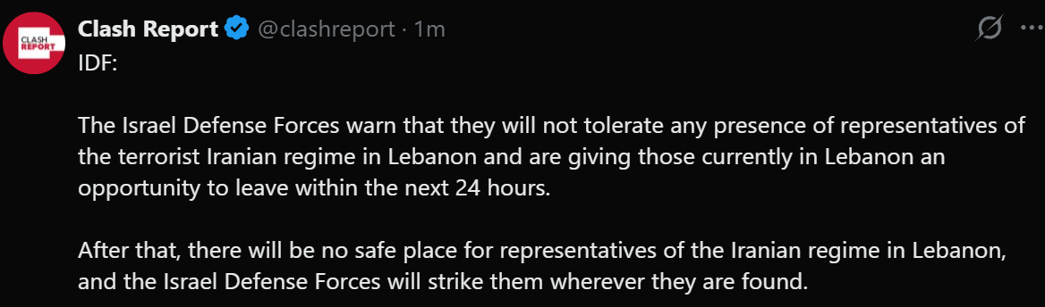>Israeli army gives Iranian commanders in Lebanon 24 hours to leave the country