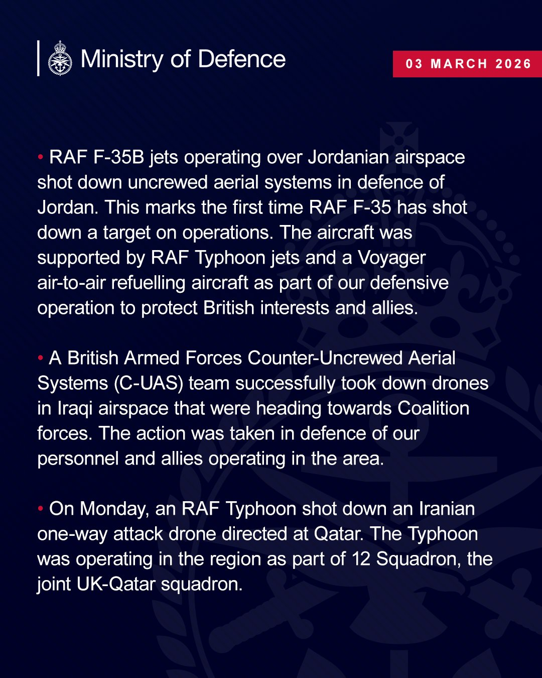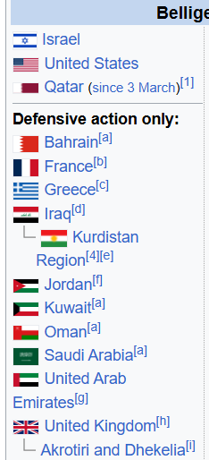 >>529760755Timeline▶Day 3:>Iranian Parliament building has been targeted by U.S.-Israeli airstrikes>IRGC says that the Strait of Hormuz has been closed and that Iran will set fire to any ship trying to pass>Qatar downed 2 Iranian Su-24 aircraft, the Qatari Defense Ministry says>QatarEnergy, accounting for 20% of global LNG trade, stops all production after attacks on its facilities >Iran strikes Saudi oil infrastructure, including ARAMCO Ras Tanura facility — one of the world’s largest oil export hubs>3 x U.S. F-15E fighter jets were shot down over Kuwait in a friendly fire incident, all crew members ejected safely and are in stable condition - CENTCOM>De-facto Iranian leader Ali Larijani says: "We will not negotiate with the United States">Hezbollah joins the war, Israel retaliates with airstrikes on Beirut; launches ground invasion of Lebanon▶Day 2:>UK, France and Germany considering "defensive action" to destroy Iranian weapon capabilities>France's aircraft carrier Charles de Gaulle is cutting short its Baltic Sea deployment and heading toward the eastern Mediterranean>Three Gulf countries are going to conduct offensive operations against Iran - Fox News>Trump says U.S. has "destroyed and sunk 9 Iranian Naval Ships" and "largely destroyed" Iran's Naval Headquarters>Six US soldiers have been killed and five are seriously wounded in Kuwait during Iranian retaliation - CENTCOM>Shipping giant Maersk says it is suspending all vessel transits through the Strait of Hormuz>The number of fatalities in Beit Shemesh, Isreal has risen to 9