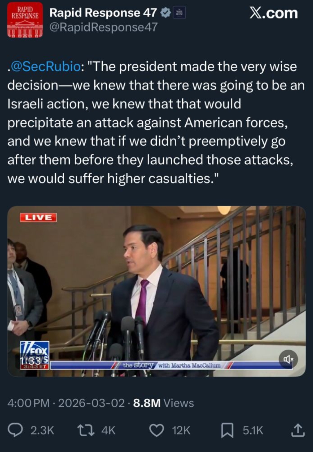 >>529762602it's funny how the situation is so bad even terminally cucked to israel people liek vance and rubio are under cutting his messaging cause they know how bad this is going to go - i'm wondering how long until join chiefs start resigning as trump smears them telling the press they told him everything would be fine