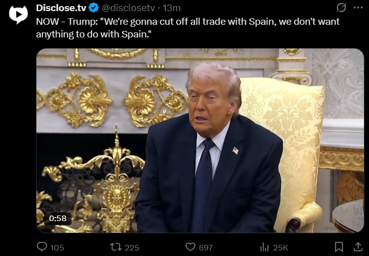 Spain also refused to increase their spending for NATO like all other countries did. It's time to dump all US-owned Spain treasury bonds, crash their currency, embargo them, and blockade their ports.