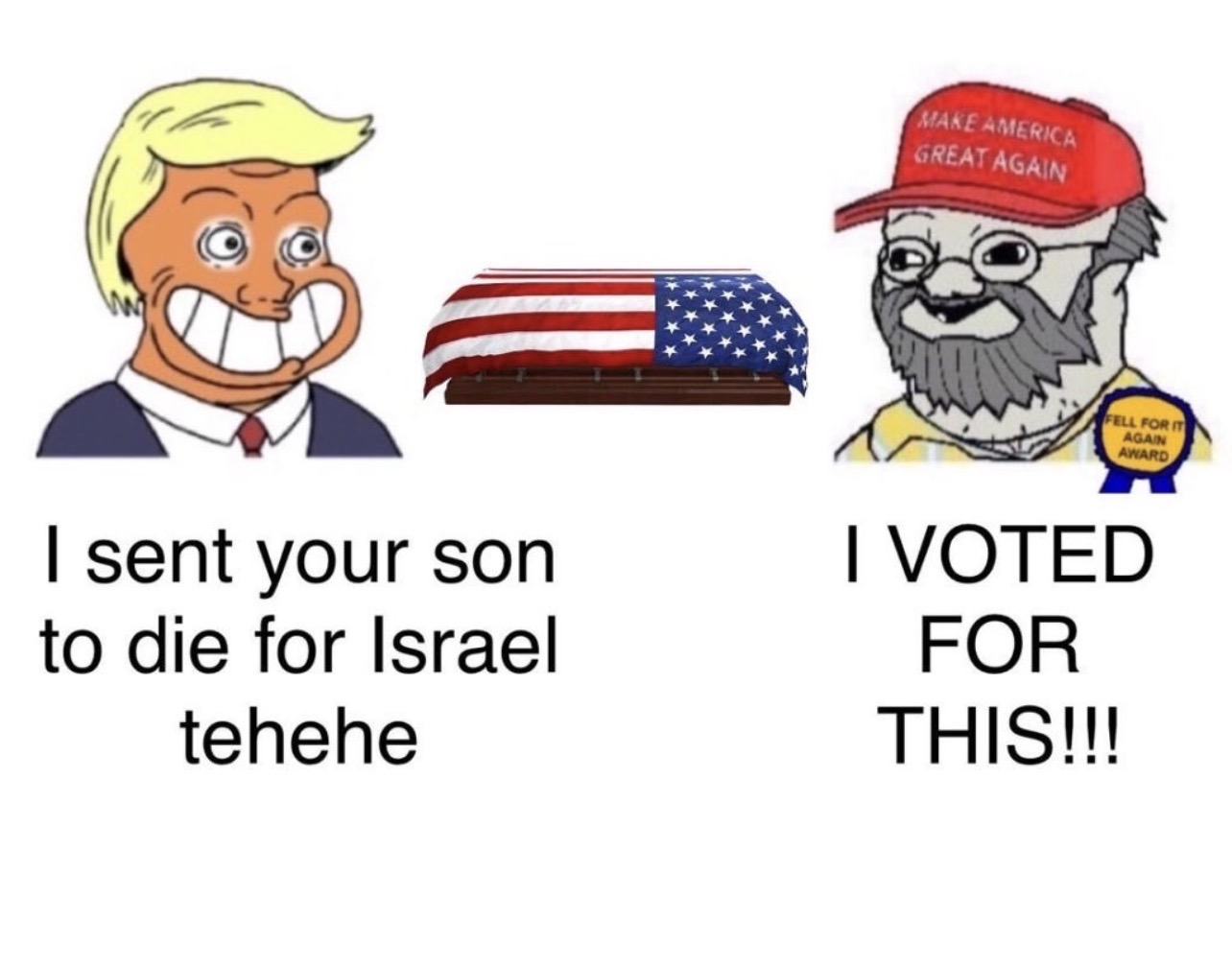 >I won't vote for Kamala because she will start a war with Iran :(>Actually I support Trump starting a war with Iran because it's at the behest of Israel :)Why are you guys like this?