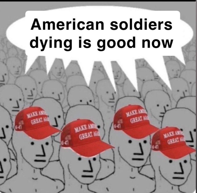 >>529772698>Americans don’t care about the bravest/mostly naive group that is the only thing between them and bombardment until deathThen they shouldn’t be Americans at all. These deaths are meaningless and what makes it worse is these retards gaffing about them.