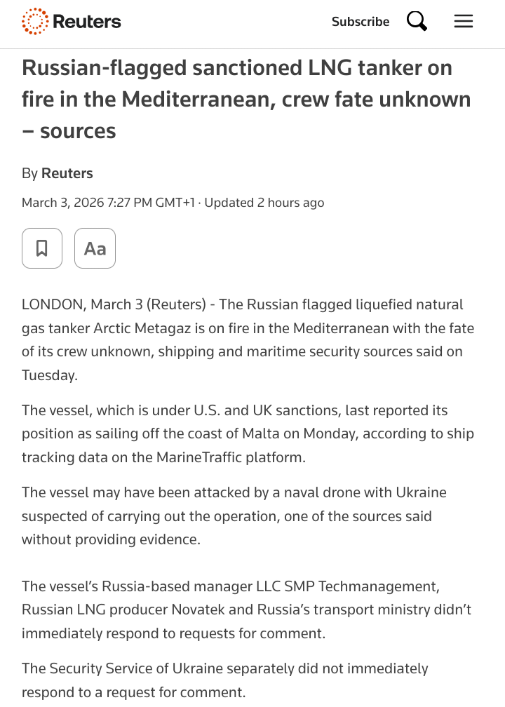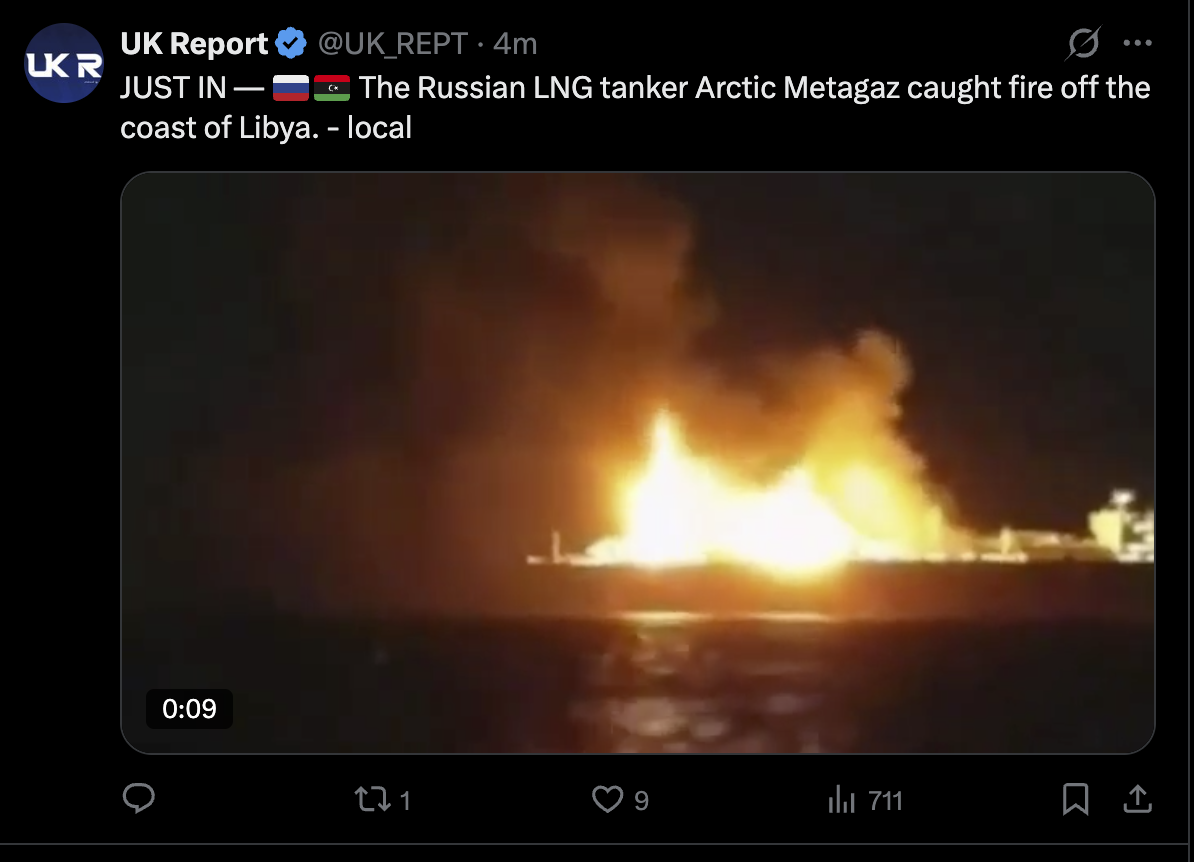 >Maritime and tracking data alongside verified photos indicate that the Russian flagged ARCTIC METAGAZ oil tanker is on fire about 150 nautical miles southeast of Malta.>Reports indicate that it was struck by USV, the origins of which are unknown.
