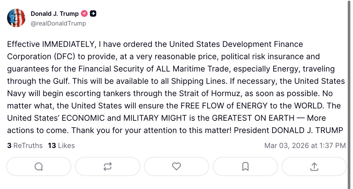 >Trump: “We will secure navigation in the Strait of Hormuz to ensure freedom of movement in the Gulf.”The entire day's gains has almost been wiped out.
