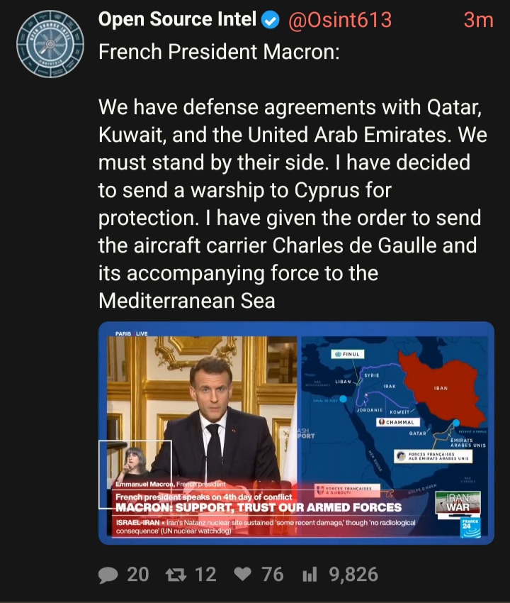 France sending aircraft carrier to the East Med/Middle East. Will be used to defend Gulf countries from attacks