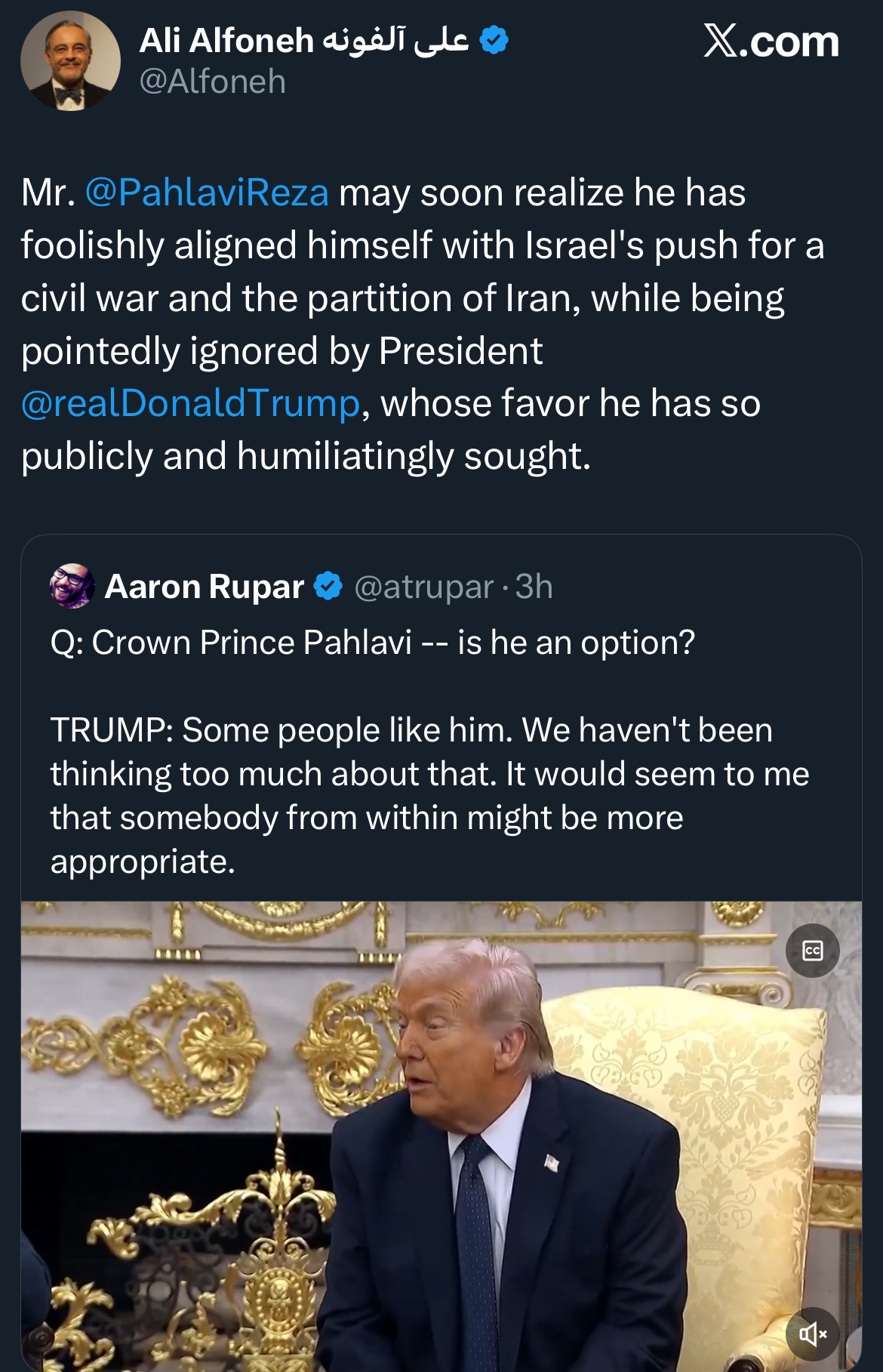 >>529772818Trump knows the Pahlavis have quite the baggage on him, he's old enough to remember that there entire reign was a byproduct of american influence in the region, and all the corruption that regime had