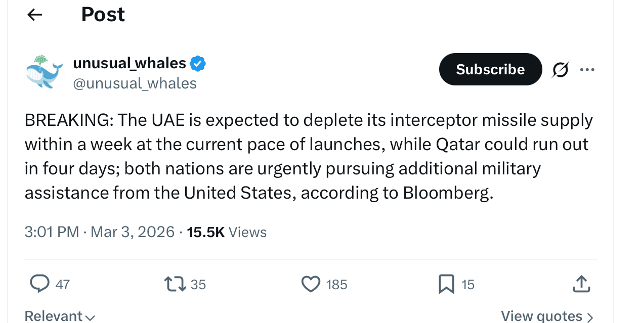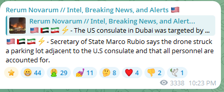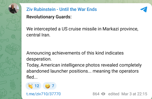 Previous: >>529766534Timeline▶Day: 4>IDF has dropped over 4,000 bombs on Iran since the war began—more than during the entire 12-day war in June>UAE considers striking Iranian missile sites as regional war spreads - Axios>USAF strategic bomber operations against Iran are expected to intensify in the coming days>Israel attacked the "Assembly of Experts" building in Qom while they were voting to choose the next supreme leader>Qatar attacked Iran in the last 24 hours, according to western sources - N12>Iran's Foreign Ministry says that fire "will engulf the entire world">Hezbollah declares "open war" on Israel - statement>The Israeli Army says its troops have been deployed at "several locations" in southern Lebanon.>Israel operated on the ground in Iran last night via Mossad and special forces - Al Arabiya>Dozens of B-52 bombers crossed the Atlantic overnight, en route to U.S. bases in Middle East>U.S. embassy in Riyadh, Saudi Arabia is struck by drones>U.S. orders mass evacuation from 14 Middle Eastern countries▶Livestreamshttps://www.youtube.com/watch?v=4E-iFtUM2kkhttps://www.youtube.com/watch?v=JHwwZRH2wz8▶Telegramhttps://rentry.org/tgnews▶Twitter accounts (using proxy frontend because twitter's UI is trash):https://nitter.net/clashreporthttps://nitter.net/FaytuksNetworkhttps://nitter.net/sentdefender▶Israel Rocket Alertshttps://www.tzevaadom.co.il/en/▶Air Traffichttps://www.flightradar24.com/https://flightaware.com/livehttps://globe.adsbexchange.com▶Maritime Traffichttps://www.marinetraffic.com/https://www.vesselfinder.com/