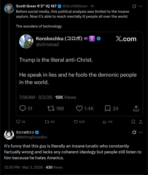 >>529776540It is fascinating what Trump does to some of these people. A war Bolton doesn't like. Hating Trump tops his hierarchy of values now. And the little Mexican was today Kamala posting again. And for MTG America first is now anti-Trump first. Not to mention the liberal white women seen in protests carrying pictures of Khamenei, who had thousands of Iranian feminists killed during his reign. If we had real human sciences what this hatred is and what it says about humans would be a really interesting research subject.