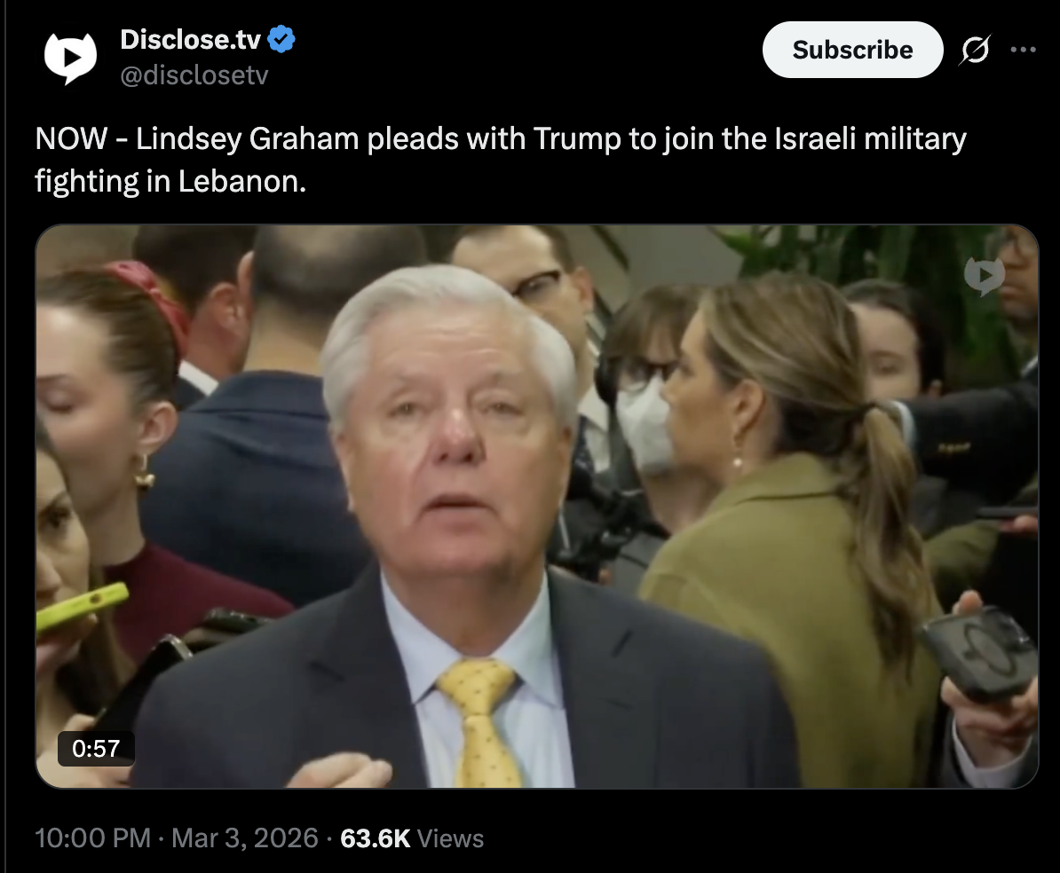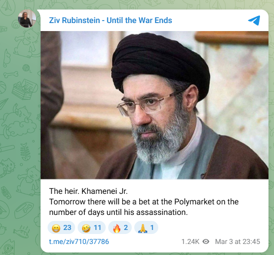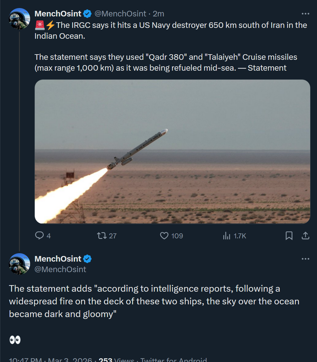 Previous: >>529780748Timeline▶Day: 4>CIA armed Kurdish forces to start an uprising in Iran - CNN>Mojtaba Khamenei, the son of the late Ayatollah, has been elected Iran's next supreme leader - Iran International>IDF has dropped over 4,000 bombs on Iran since the war began—more than during the entire 12-day war in June>UAE considers striking Iranian missile sites as regional war spreads - Axios>USAF strategic bomber operations against Iran are expected to intensify in the coming days>Israel attacked the "Assembly of Experts" building in Qom while they were voting to choose the next supreme leader>Qatar attacked Iran in the last 24 hours, according to western sources - N12>Iran's Foreign Ministry says that fire "will engulf the entire world">Hezbollah declares "open war" on Israel - statement>The Israeli Army says its troops have been deployed at "several locations" in southern Lebanon.>Israel operated on the ground in Iran last night via Mossad and special forces - Al Arabiya>Dozens of B-52 bombers crossed the Atlantic overnight, en route to U.S. bases in Middle East>U.S. embassy in Riyadh, Saudi Arabia is struck by drones>U.S. orders mass evacuation from 14 Middle Eastern countries▶Livestreamshttps://www.youtube.com/watch?v=4E-iFtUM2kk https://www.youtube.com/watch?v=JHwwZRH2wz8 ▶Telegramhttps://rentry.org/tgnews▶Twitter accounts (using proxy frontend because twitter's UI is trash):https://nitter.net/clashreporthttps://nitter.net/FaytuksNetworkhttps://nitter.net/sentdefender▶Israel Rocket Alertshttps://www.tzevaadom.co.il/en/▶Air Traffichttps://www.flightradar24.com/https://flightaware.com/livehttps://globe.adsbexchange.com▶Maritime Traffichttps://www.marinetraffic.com/https://www.vesselfinder.com/