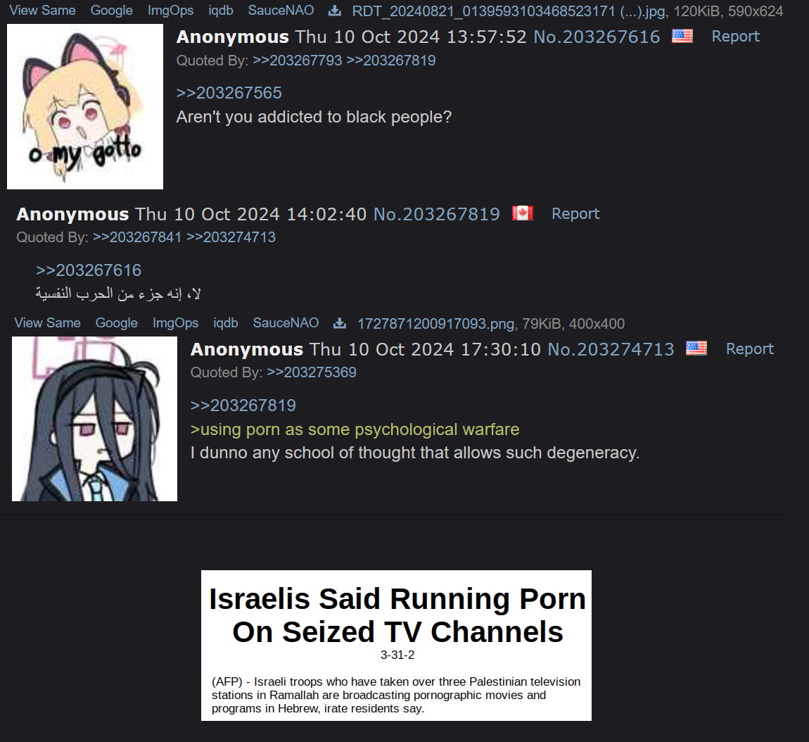 >>529789423This is actually the opinion of the majority of people on /pol/, particularly the both anti-muslim and anti-jew stance. The minority who actually pick a side are a mixture of: >people with a real bone in the fight (Ukrainians, Russians, Israelis)>tourists from reddit and other boards>some with American flags who I assume are vets because they sure can't help sucking Israeli cock at every oppprtunity These groups are poisoning pretty much all discourse because they immediately accuse you of being a shill or jew or brown or muslim or russian or whatever unless you immediately agree with their opinions. This has always been an issue on /pol/ but its gotten especially bad since Russia/Ukraine started and will probably get even worse now with Israel/Iran.