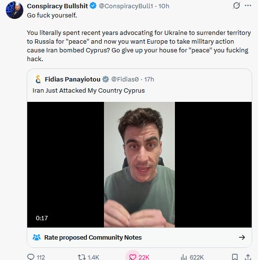 You know that zigger from Cyprus that constantly calls for Ukraine to surrender to Russia and insists Ukrainian kids like being kidnapped? He was kvetching about Iran bombing Cyprus and got ratio'd so hard he deleted his og video kek